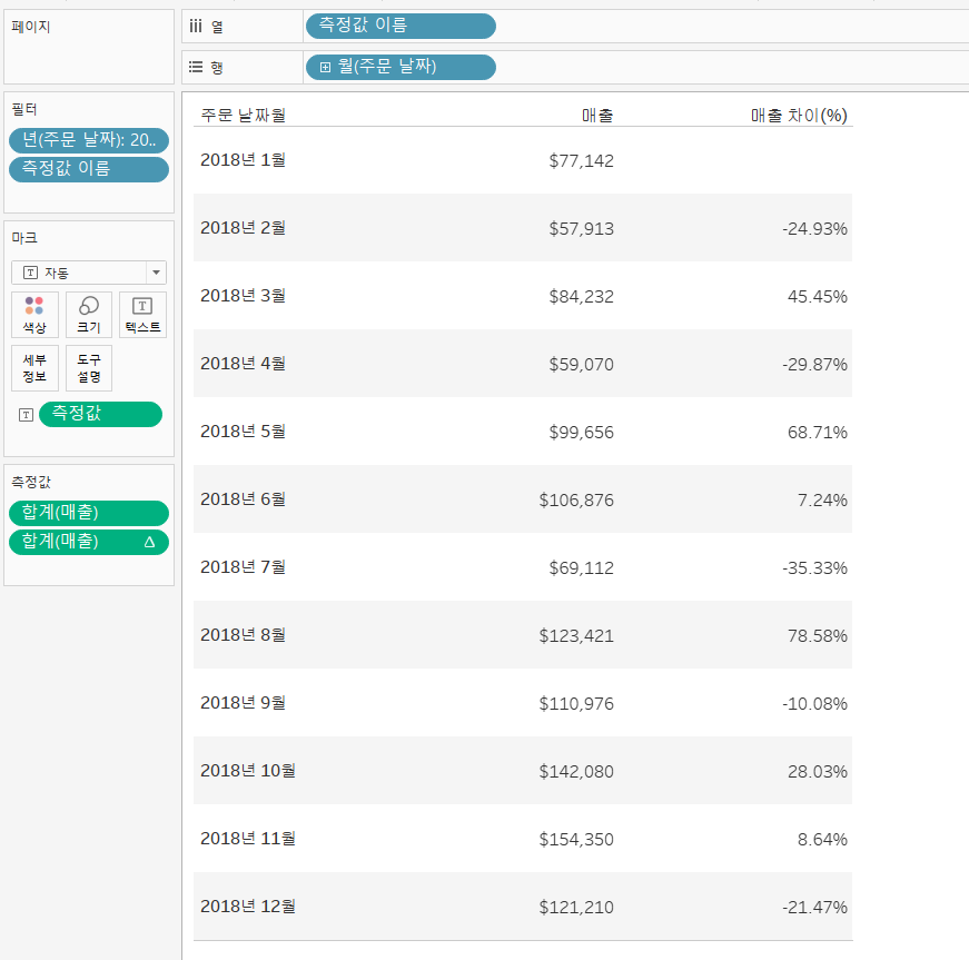 주문 날짜에 따른 매출액과, 지난달과의 매출 차이를 보여주는 시트입니다.